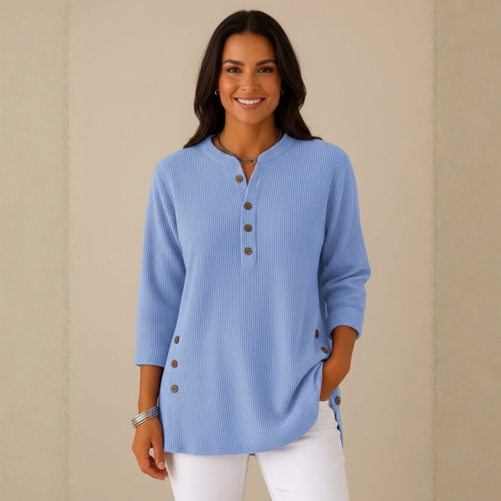 De Claudia Buikcomfort Tuniek biedt een perfecte combinatie van stijl en comfort, waardoor je je zelfverzekerd voelt in elke situatie. Deze tuniek valt soepel over buik en heupen, waardoor het een flatterende pasvorm heeft voor dames van 50+. Gemaakt van zachte geribde stof, biedt het zowel warmte als de juiste hoeveelheid rek. De subtiele knoopsluiting voegt een uniek detail toe aan het klassieke ontwerp, waardoor het veelzijdig is voor verschillende gelegenheden.