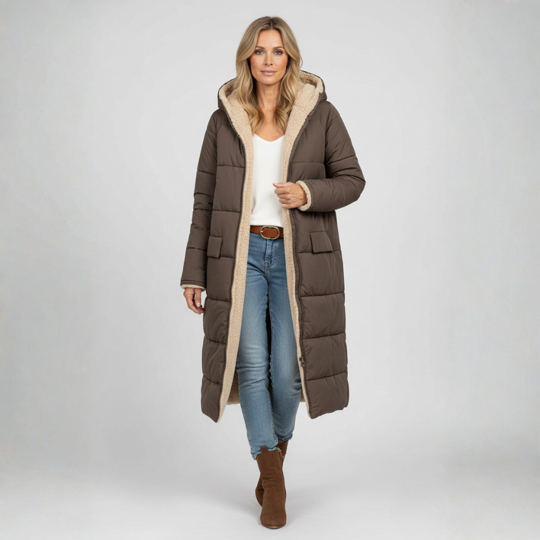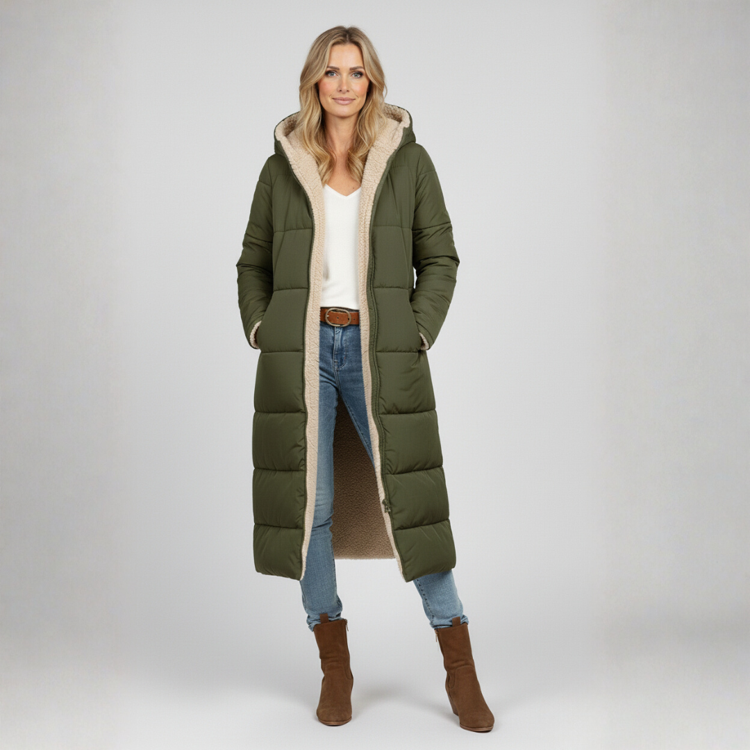 Eva Lange Winterjas | Dames Lange Gewatteerde Jas, Omkeerbaar Ontwerp, Met Capuchon